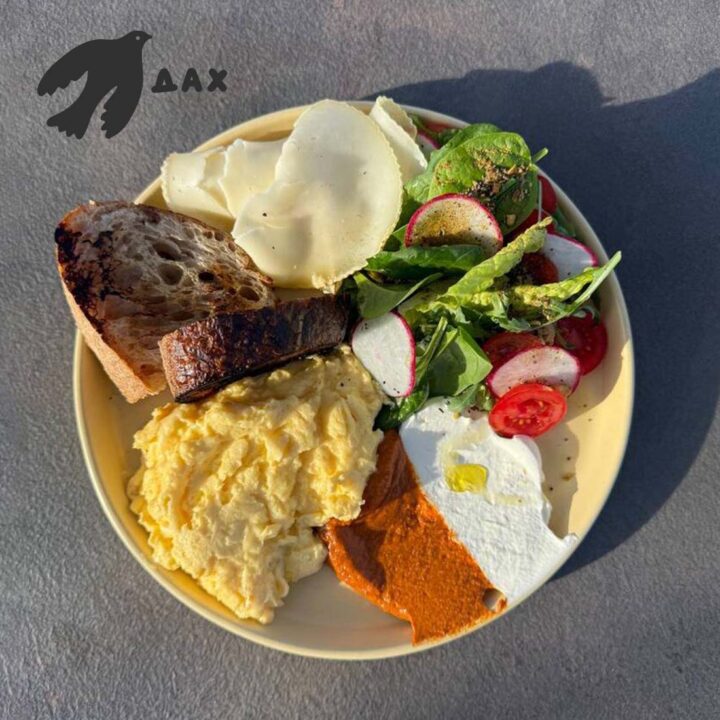 Мікс салатів, чері, цитрусовий крем-сир, мухамара, сир том, хліб та яйце на вибір (скрамбл або смажене)