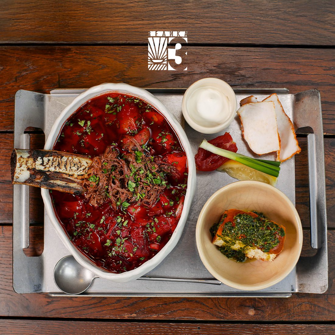 Борщ на основі яловичого бульйону з додаванням бурякового фрешу. Подається з яловичиною, салом, зеленою цибулею, соленими лимонами, квашениною, пампушками та сметаною.