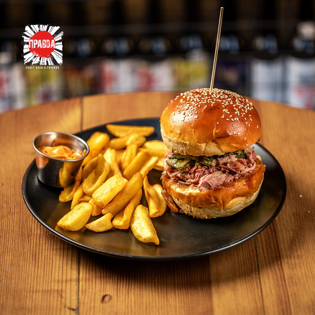 Вершкова булка, соковита копчена лопатка з додаванням смаженого помідора та  цукемона. Подається разом з картопляними діпами та соусом айолі.
