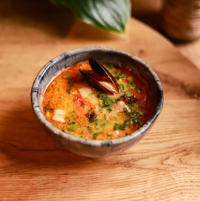 Пструг та скальки, приготовані на рибному бульйоні з цибулею порей та ріпчастою, болгарським перцем з вершками, кукурудзою, шпондером та курячим філе.