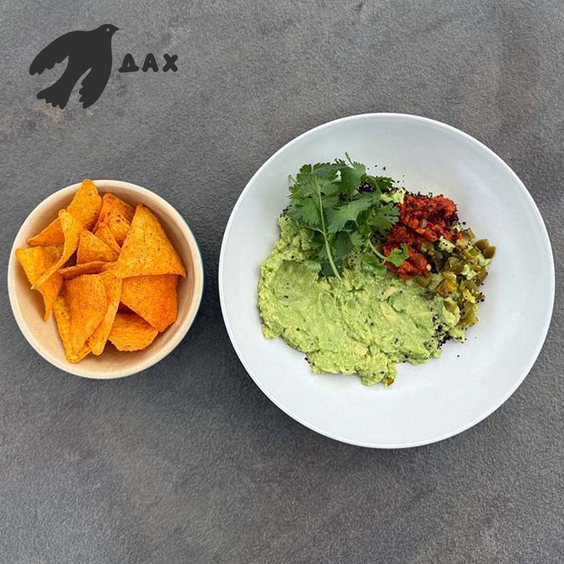 Гуакамоле з начосами, заправляється лимонним соком та сіллю, подається з кінзою, в’яленими томатами та халапеньйо.