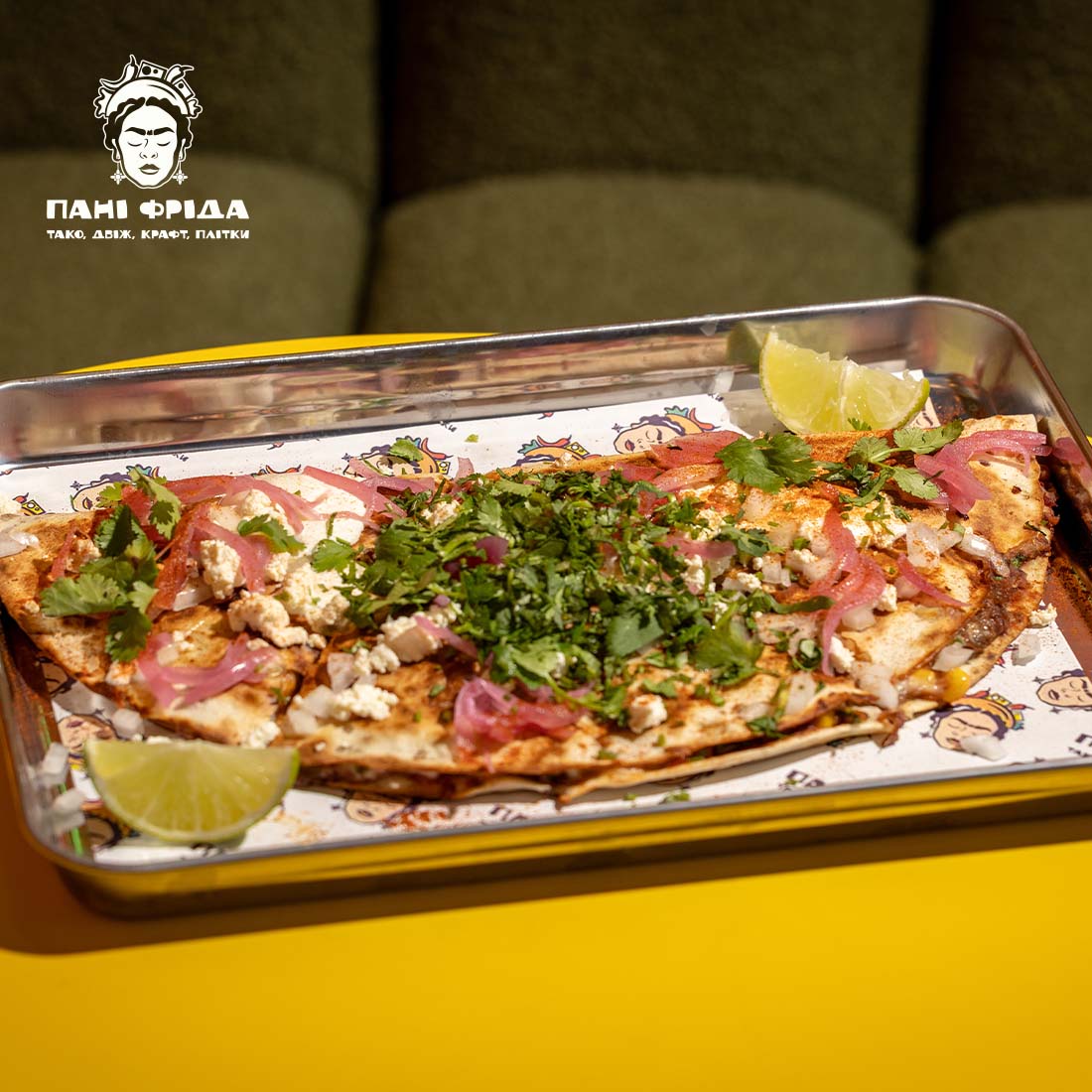 Рвана яловичина, квасоля, сир, салат: кукурудза, авокадо, цибуля біла, сальса, маринована цибуля, «Крема Мексикана».