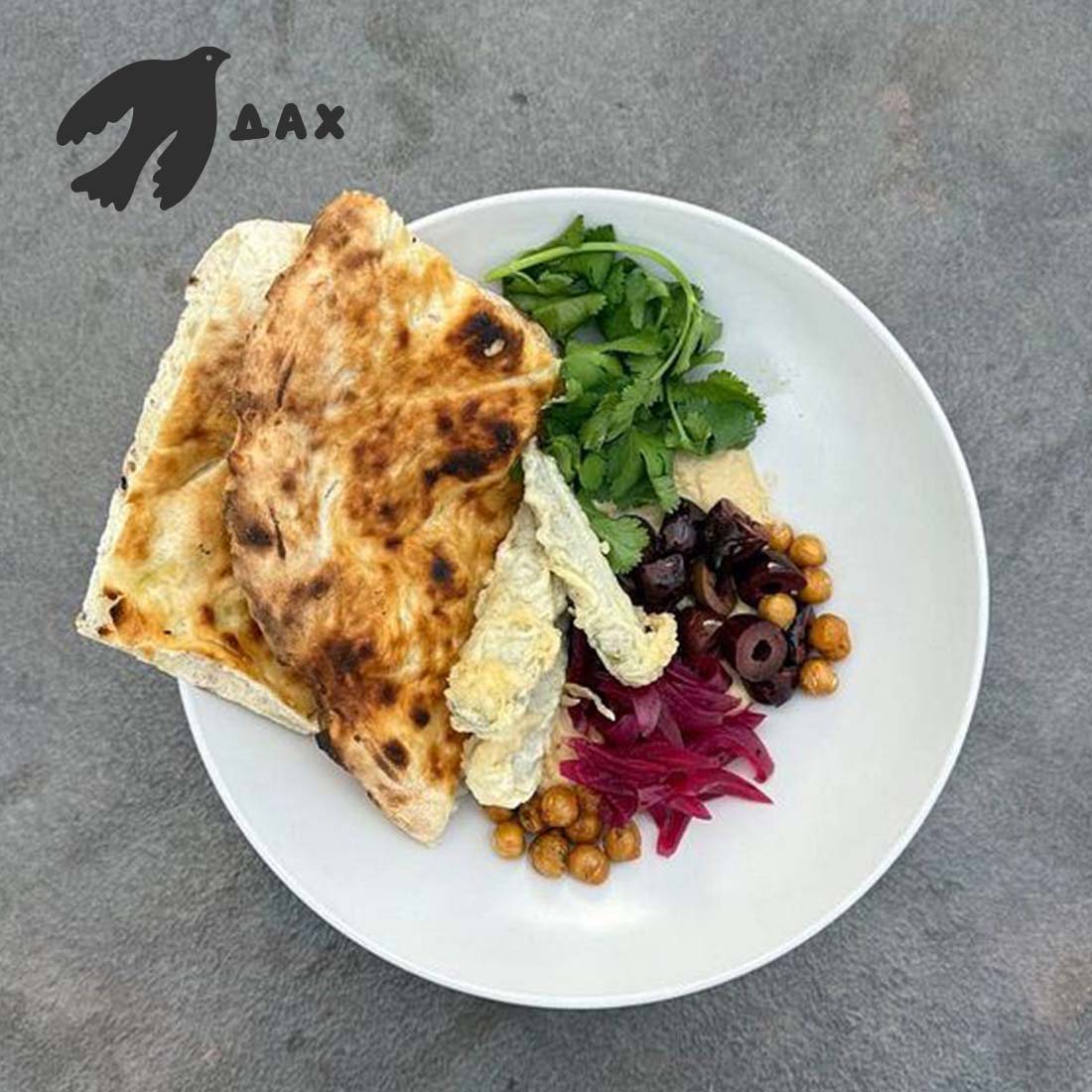 Маринована цибуля, нут, оливки, кінза, квашений огірок темпура.