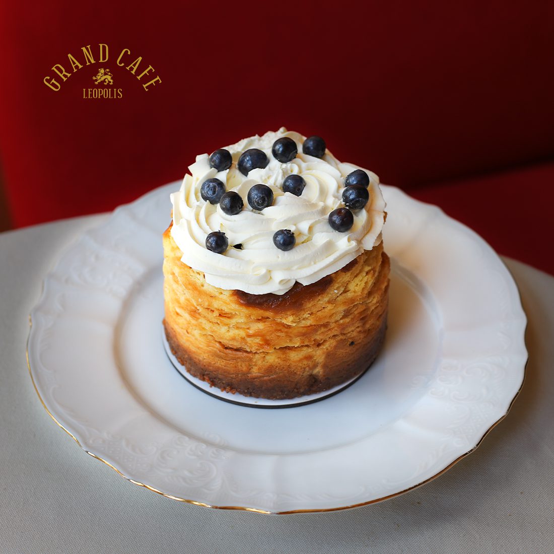 Ніжний відверто панський сирник. Повітряний крем-сир і чорничне пюре на основі із пісочного тіста з цинамоном, прикрашений кремом на основі сиру маскарпоне.