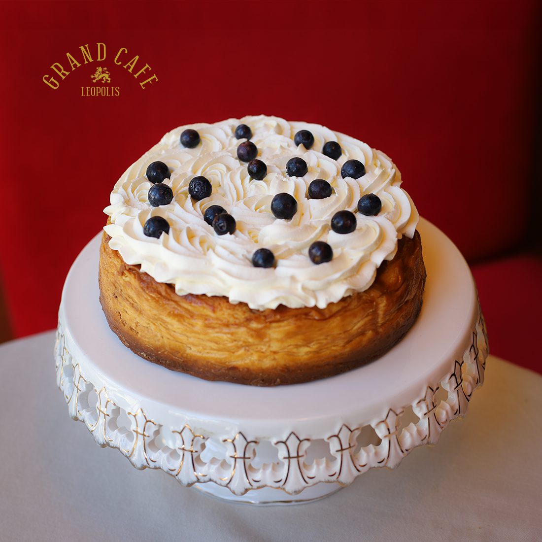 Ніжний відверто панський сирник. Повітряний крем-сир і чорничне пюре на основі із пісочного тіста з цинамоном, прикрашений кремом на основі сиру маскарпоне.