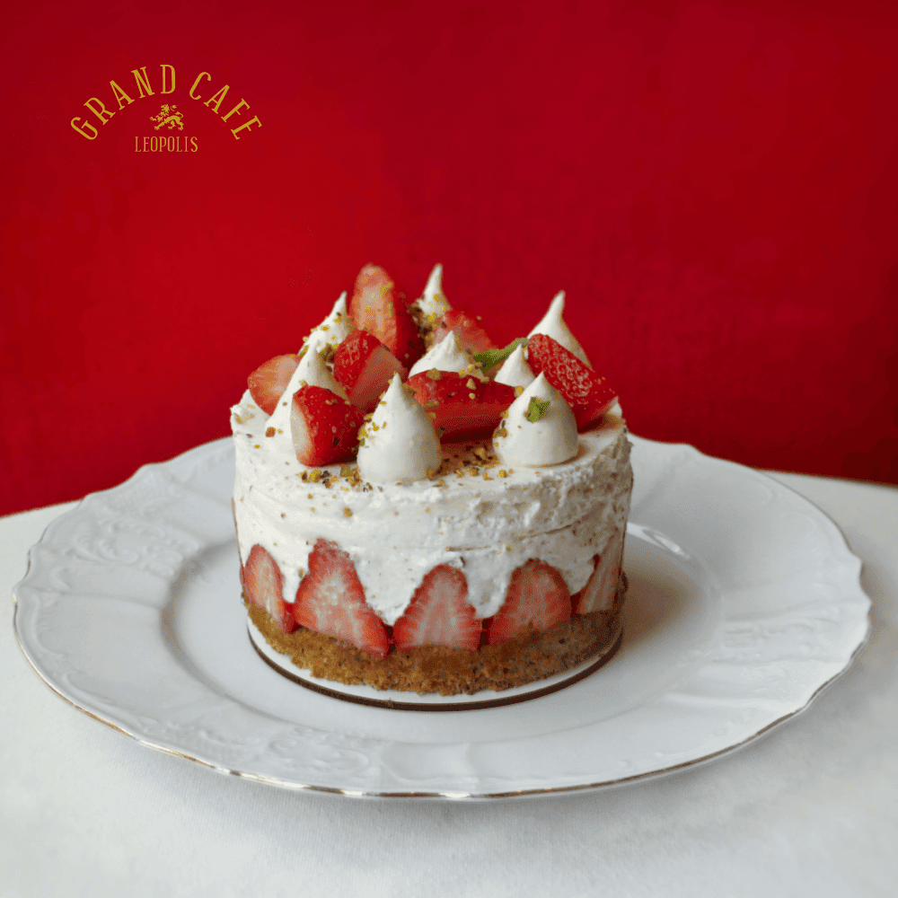 Вишуканий традиційний французький торт з фісташковими шарами бізе, перемащений кремом з білого шоколаду, та свіжими полуницями
