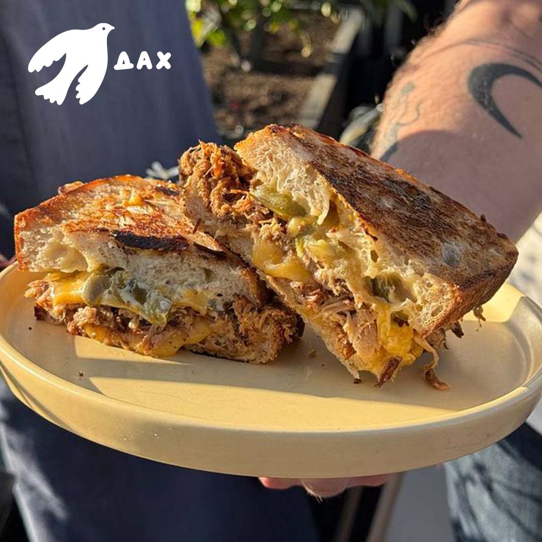 Мелт з рваним індиком, сулугуні – чедер, халапеньйо, гірчиця, биті огірки та соус bbq.