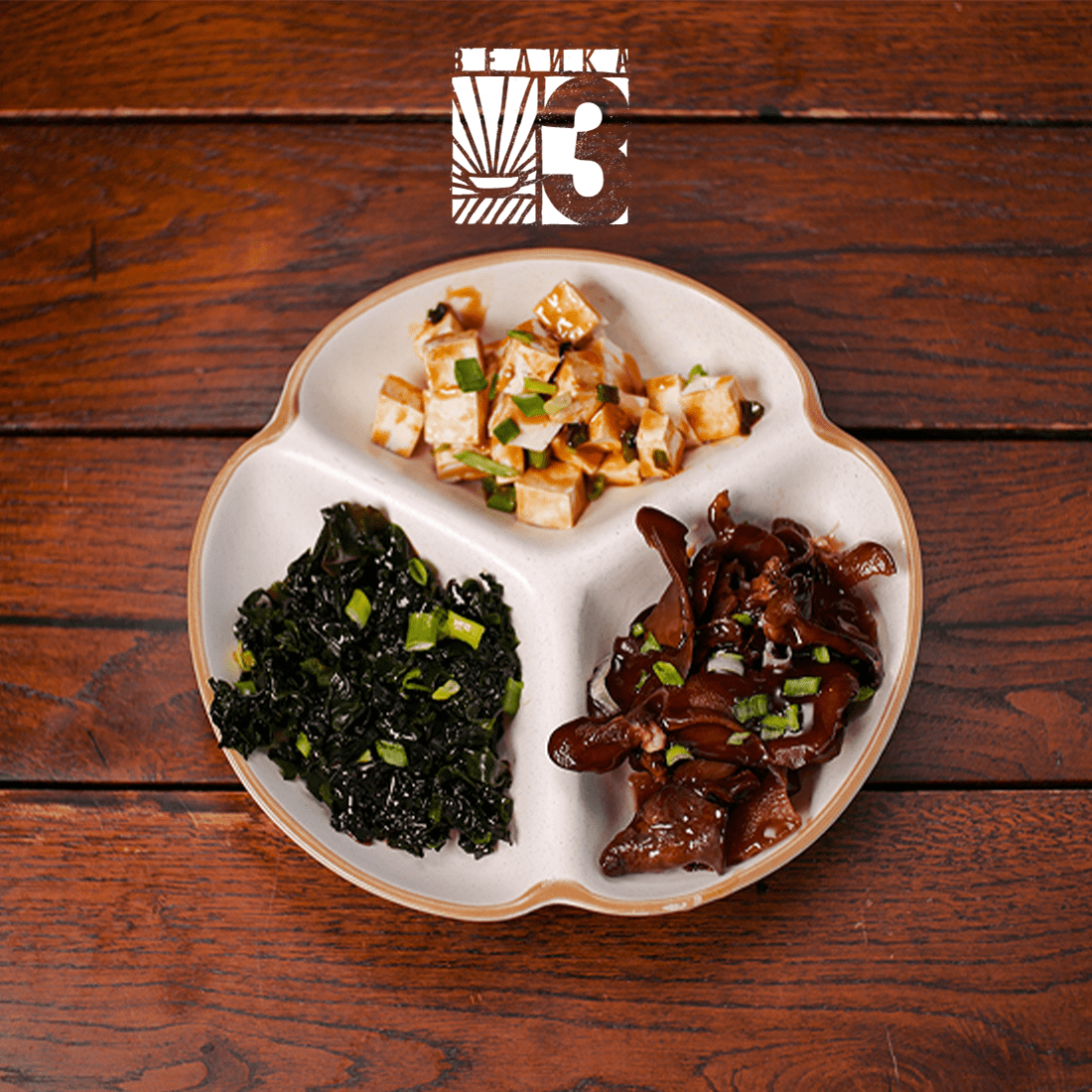 Мариновані гриби муер, тофу та водорості вакаме.