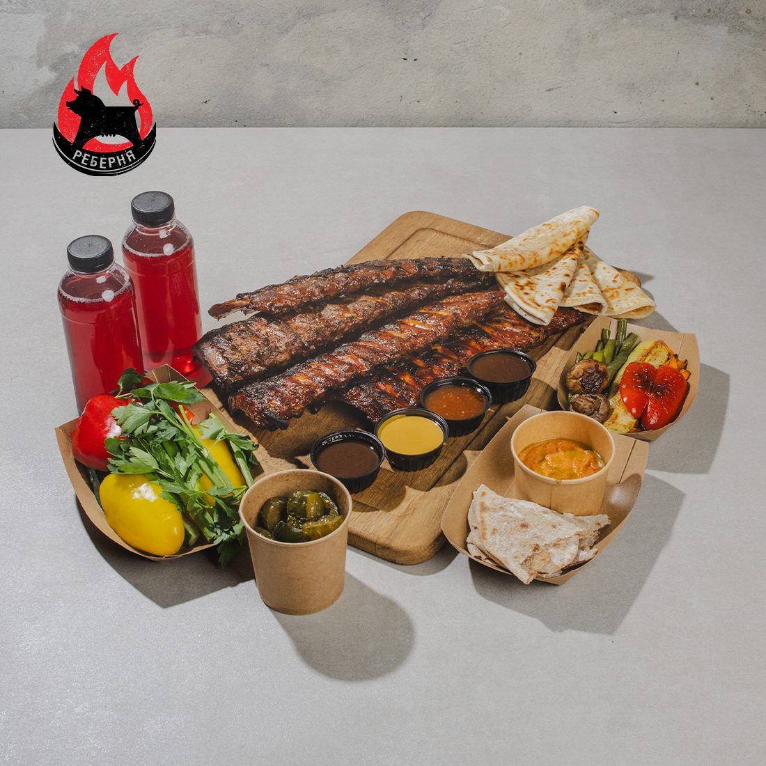 – 4 порції Ребер на вогні  + 4 соуси (2 барбекю та 2 гірчичні)