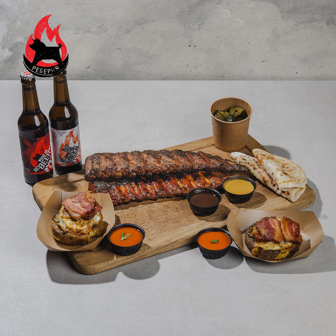– 2 порції Ребер на вогні  + 2 соуси (барбекю та гірчичний)