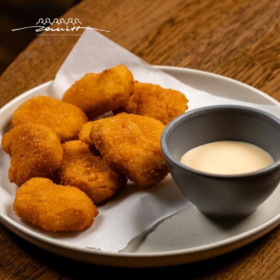 Смажене філе курчати в паніровці з паприкою, куркумою та імбиром. Подаємо із соусом з вершків, молока та сиру чеддер.