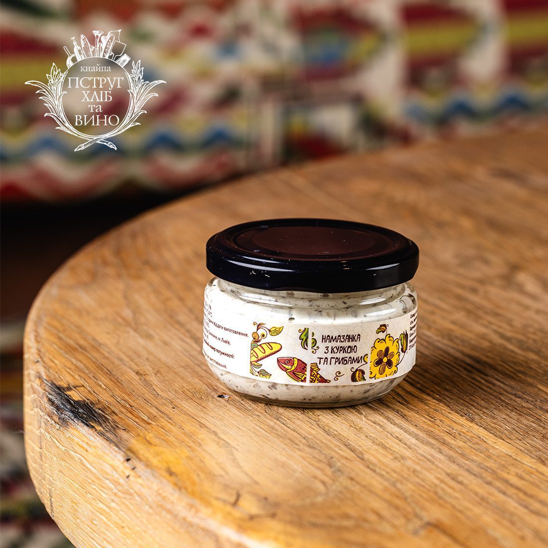 Тушкована та перемелена курка і гриби, майонез, спеції.