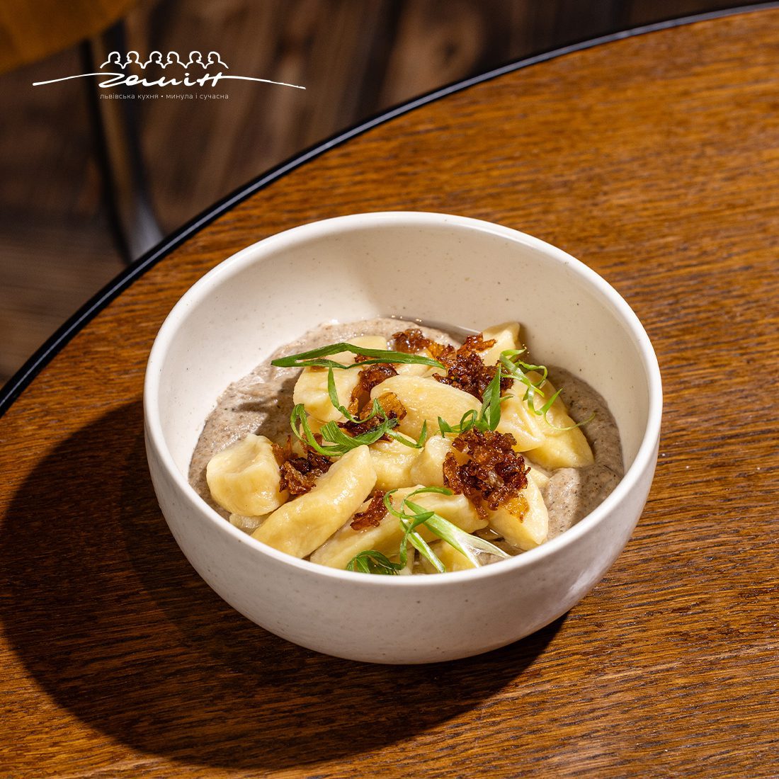 Картопляні палюшки з вершковою підливою з білих грибів та карамелізованою цибулею.