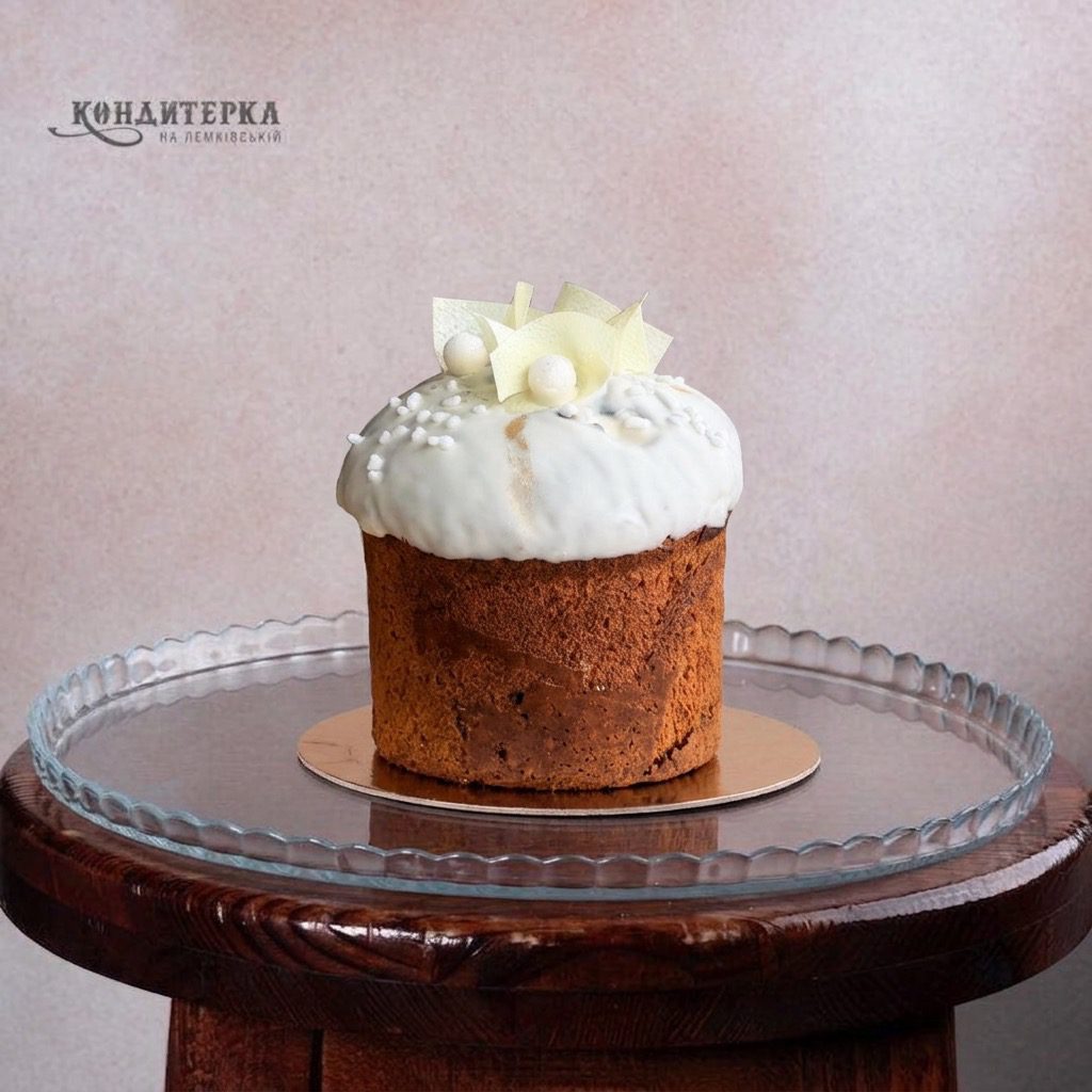 Ніжне тісто на основі молока, яєць, борошна, цедри лимона та родзинок. Вафельний декор, горішки, шоколад, харчовий глітер.