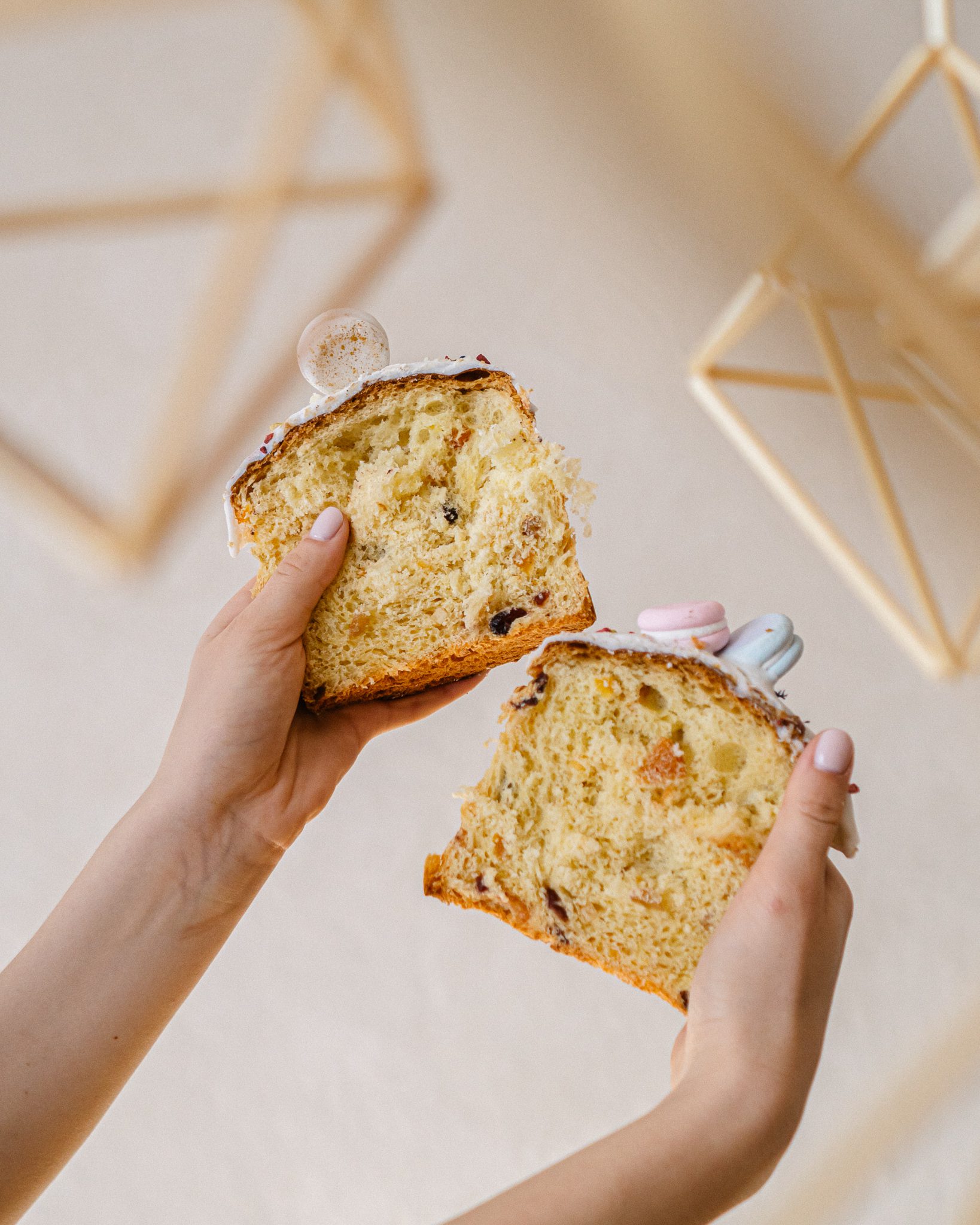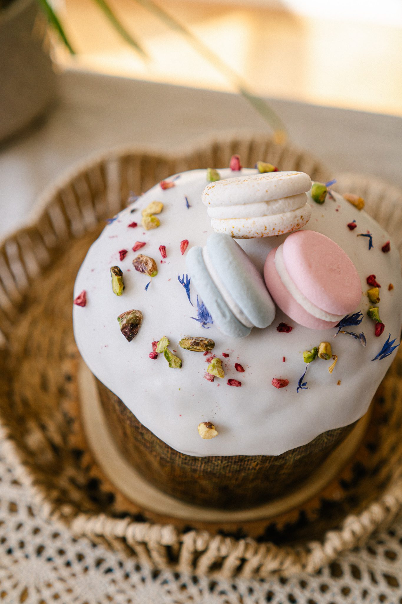 Цукор, молоко, масло, борошно, цукор ванільний, дріжджі, лимон, родзинки, апельсинові цукати, журавлина, курага, кардамон, сіль, помадка фондант біла, макарони.