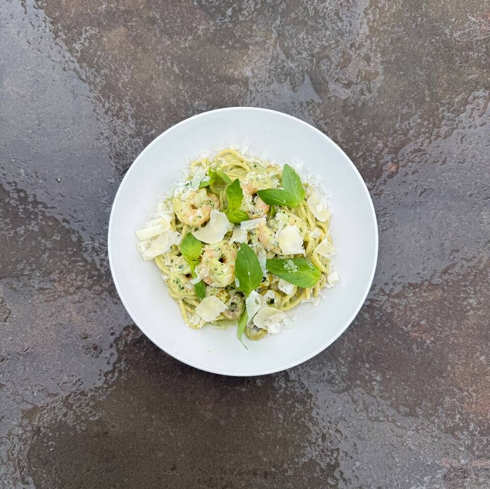 Паста з креветками зі свіжим базиліком та пармезаном.