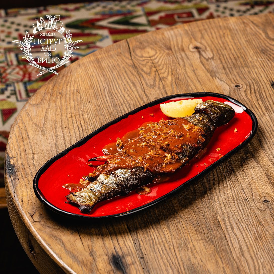 Пікантна карпатська річкова форель з цитриною під помідоровим гострим соусом, посипана зверху приправою зі смаженої цибулі.