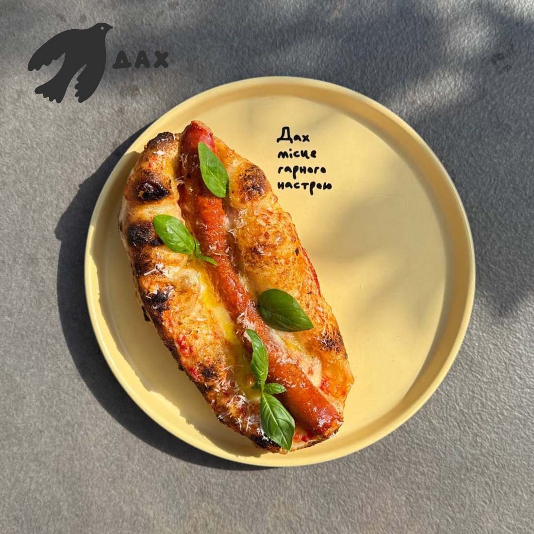 Мисливська ковбаска, томатний соус, моцарела та пармезан.