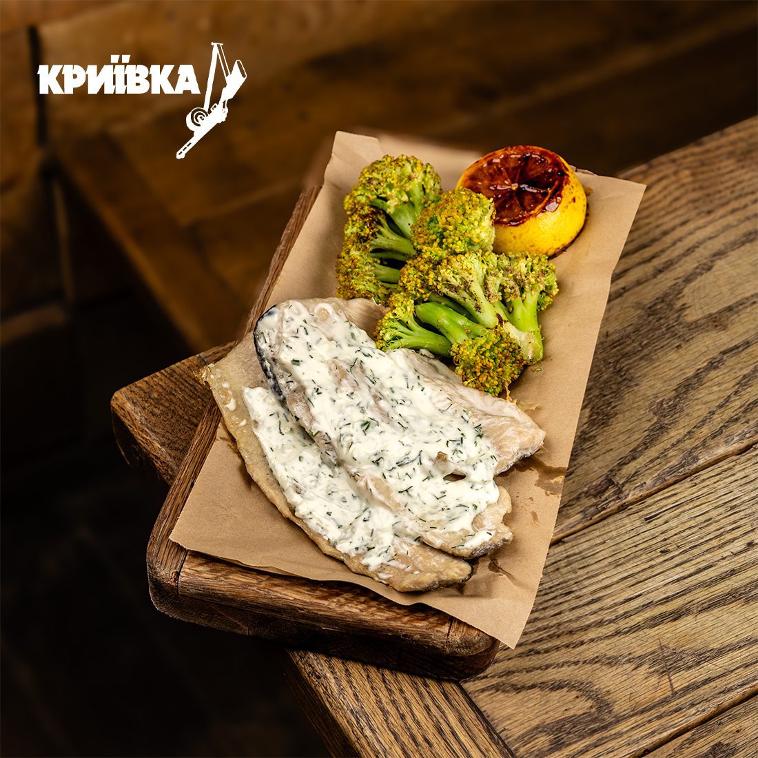 Філерована річкова форель (філе), броколі, лимон. Вершковий соус (вершки коров’ячого молока, часник, кріп, сіль, борошно, перець чорний мелений).