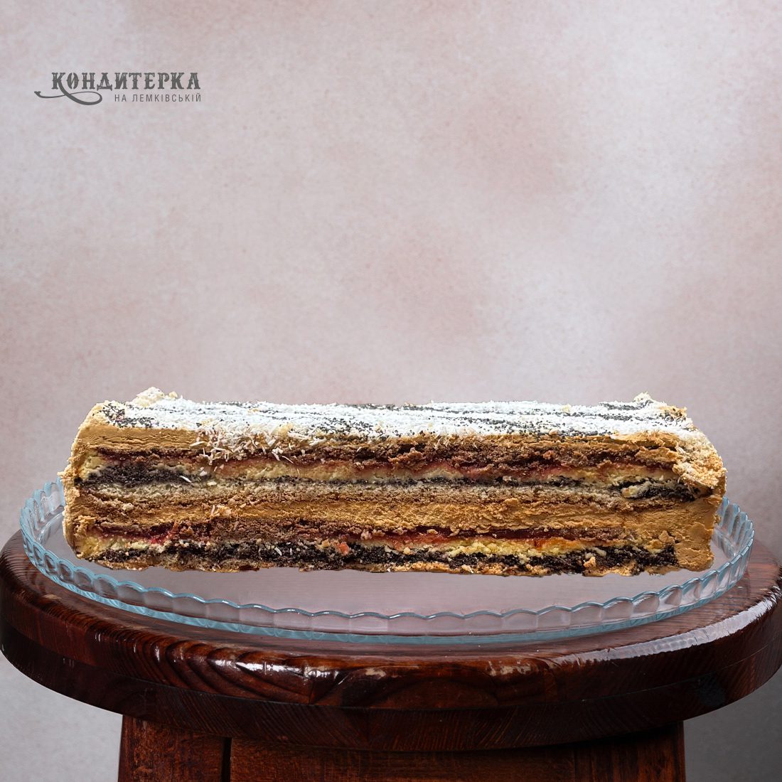 Пісочна основа, вишневий наповнювач, сирний корж, маковий корж, масляний крем зі згущеним молоком.