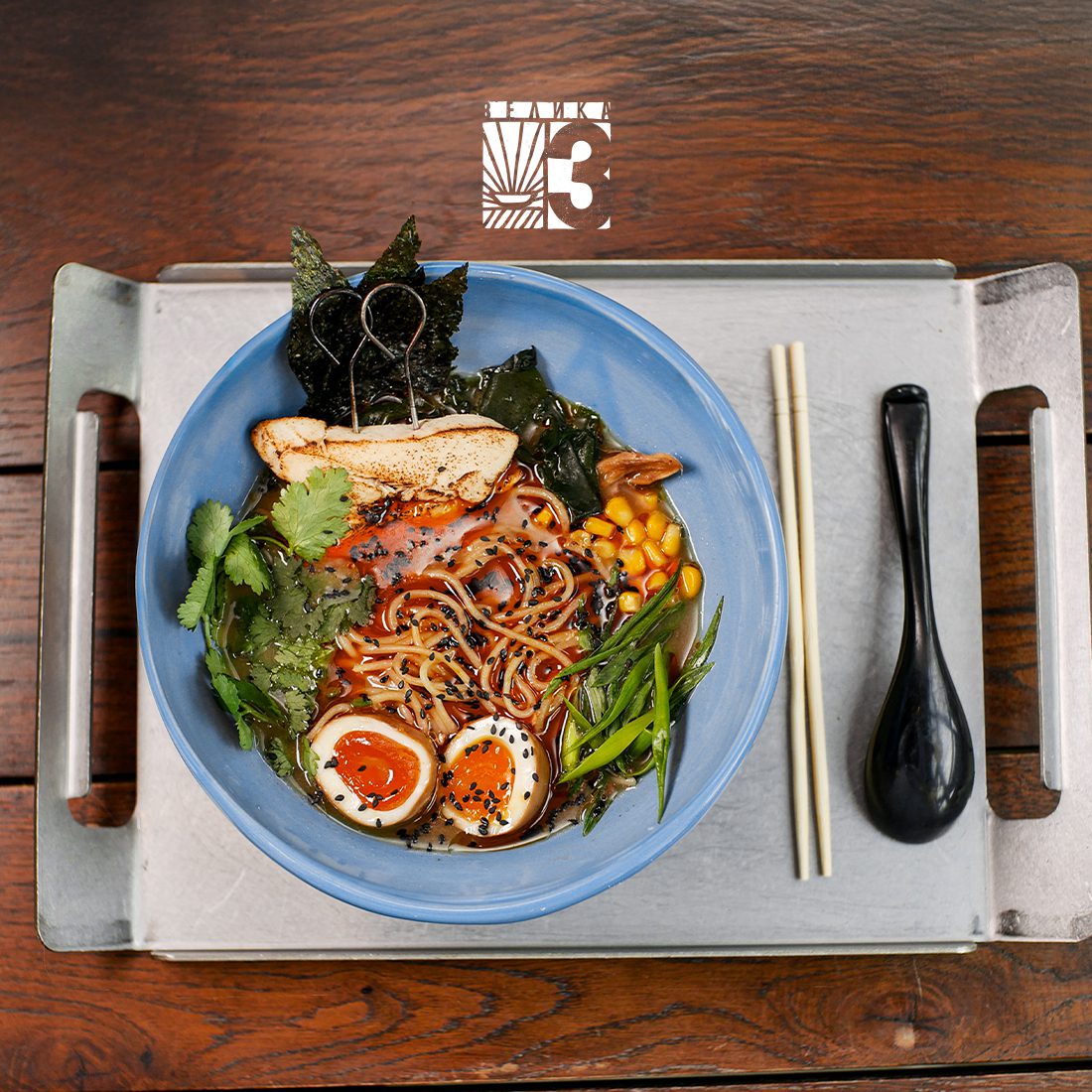 Бульйон курячий, рисово-мигдалеве молоко, водорості вакаме і норі, кукурудза, стегно куряче, гливи, мариноване яйце, олія чилі, свіжа кінза, зелена цибуля, чорний кунжут.