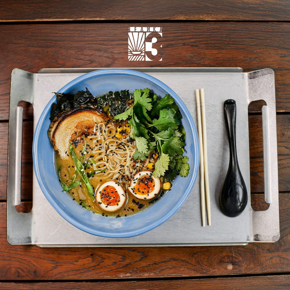 Оновлений рамен із насиченим кремовим бульйоном, який готується на основі коренеплодів, водоростей даші комбо, грибів шиїтаки, місо пасти та стружки тунця. Завдяки рисово-мигдальному молоку він набуває ніжної, оксамитової текстури. Подається з локшиною власного виробництва, рулетом зі свинини, водоростями вакаме та норі, кукурудзою, маринованими яйцем та гливами в новому маринаді. Зверху додаємо кінзу, чорний кунжут та ароматну зелену олію.