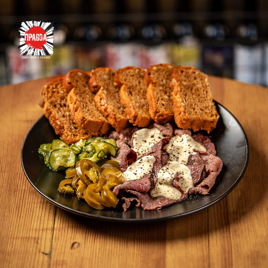 Копчений наслайсований ростбіф з соусом цезар, маринованим перцем халапеньйо, цукемонами та гречаною грінкою