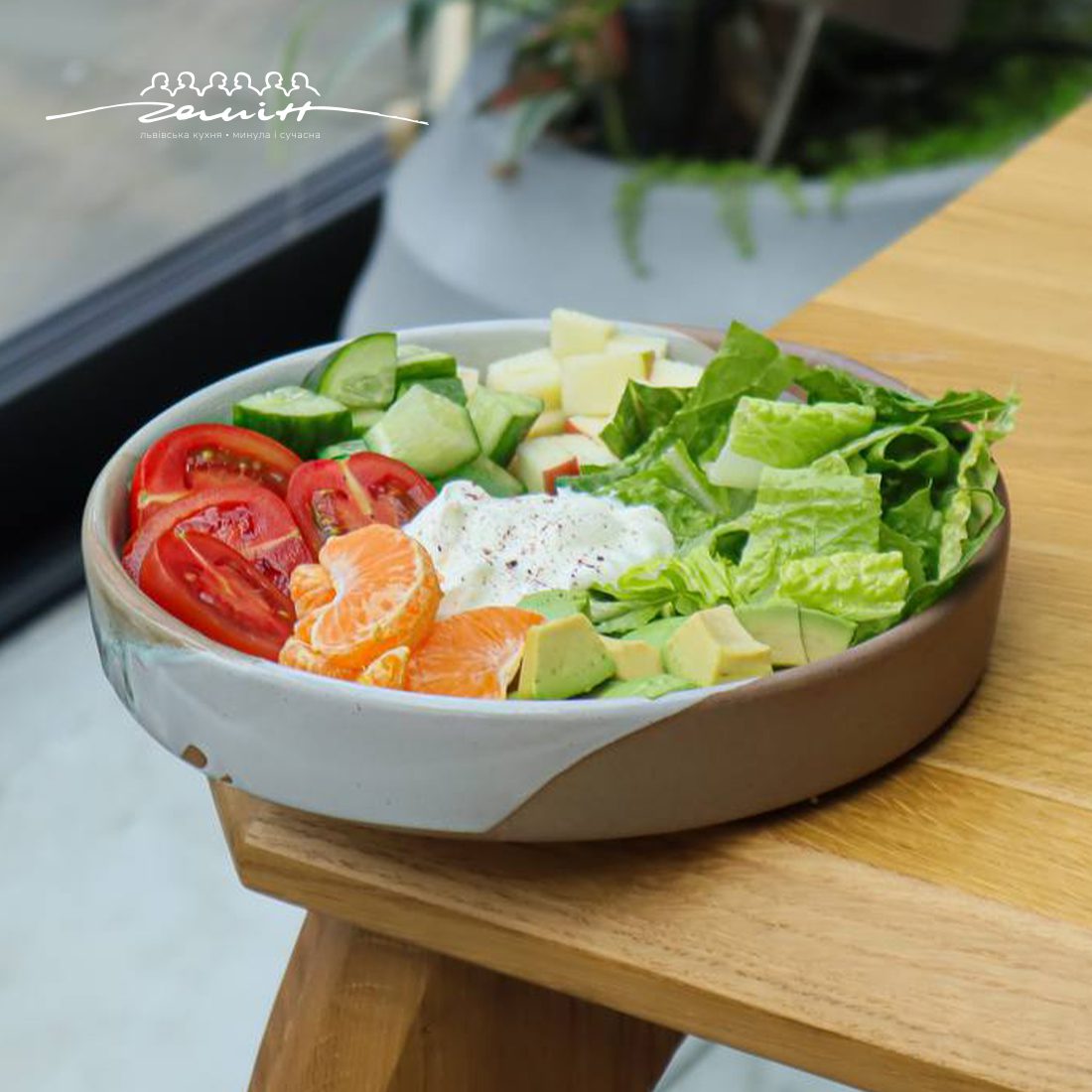 Хурма, яблуко, авокадо, чері, огірок і салат ромен під соусом з грецького йогурту з приправою сумах.