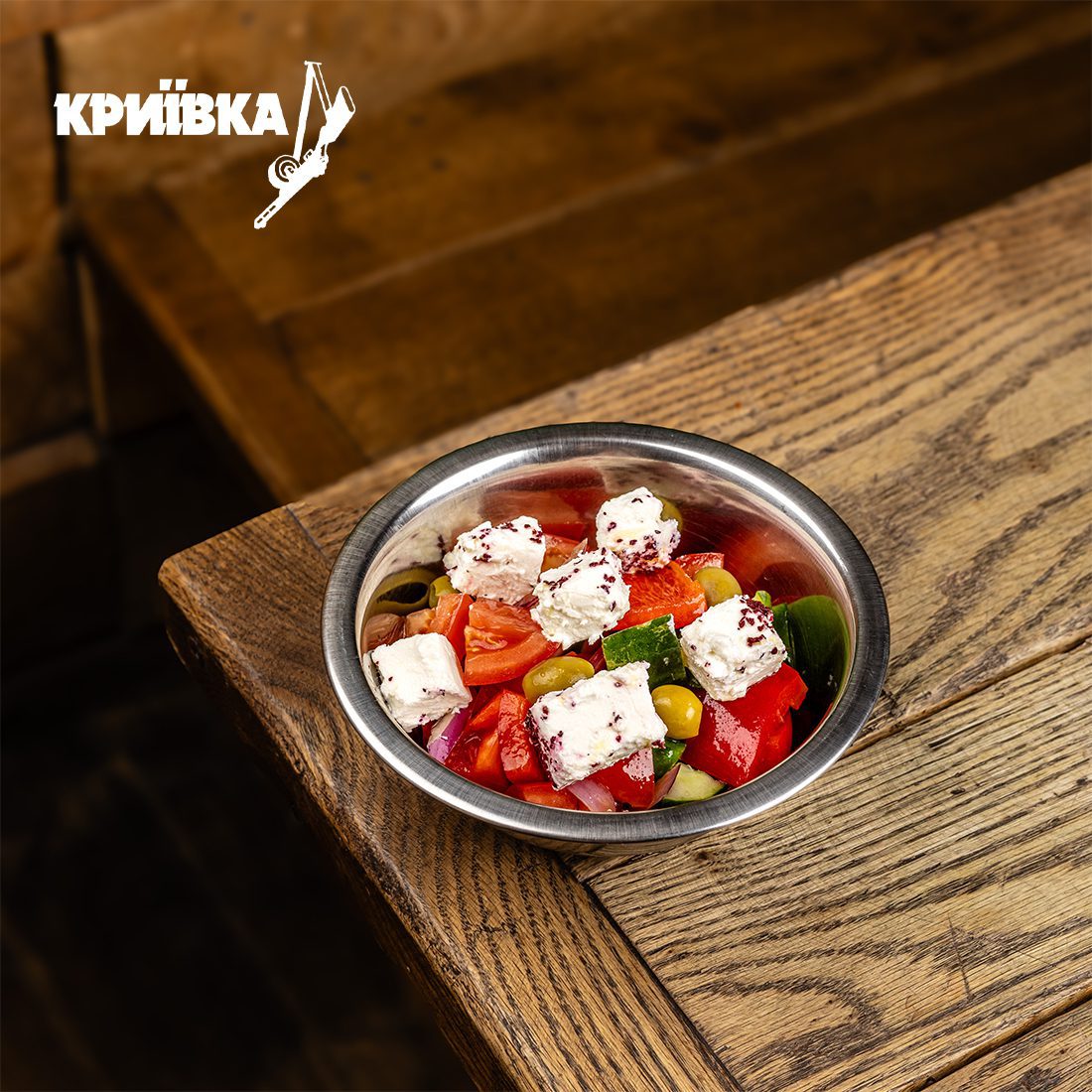Сир фета(маринується в сумах), огірок, помідор, перець, оливки, цибуля червона, оливкова олія.