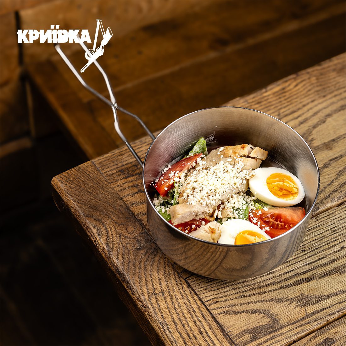 Куряче філе обсмажується в фритюрі, салат ромен вимішується в соусі, помідор, одне яйце розрізається навпіл, зверху посипається сиром бринзою. Соус з анчоусів: філе анчоуса, гірчиця, майонез, часникова паста.