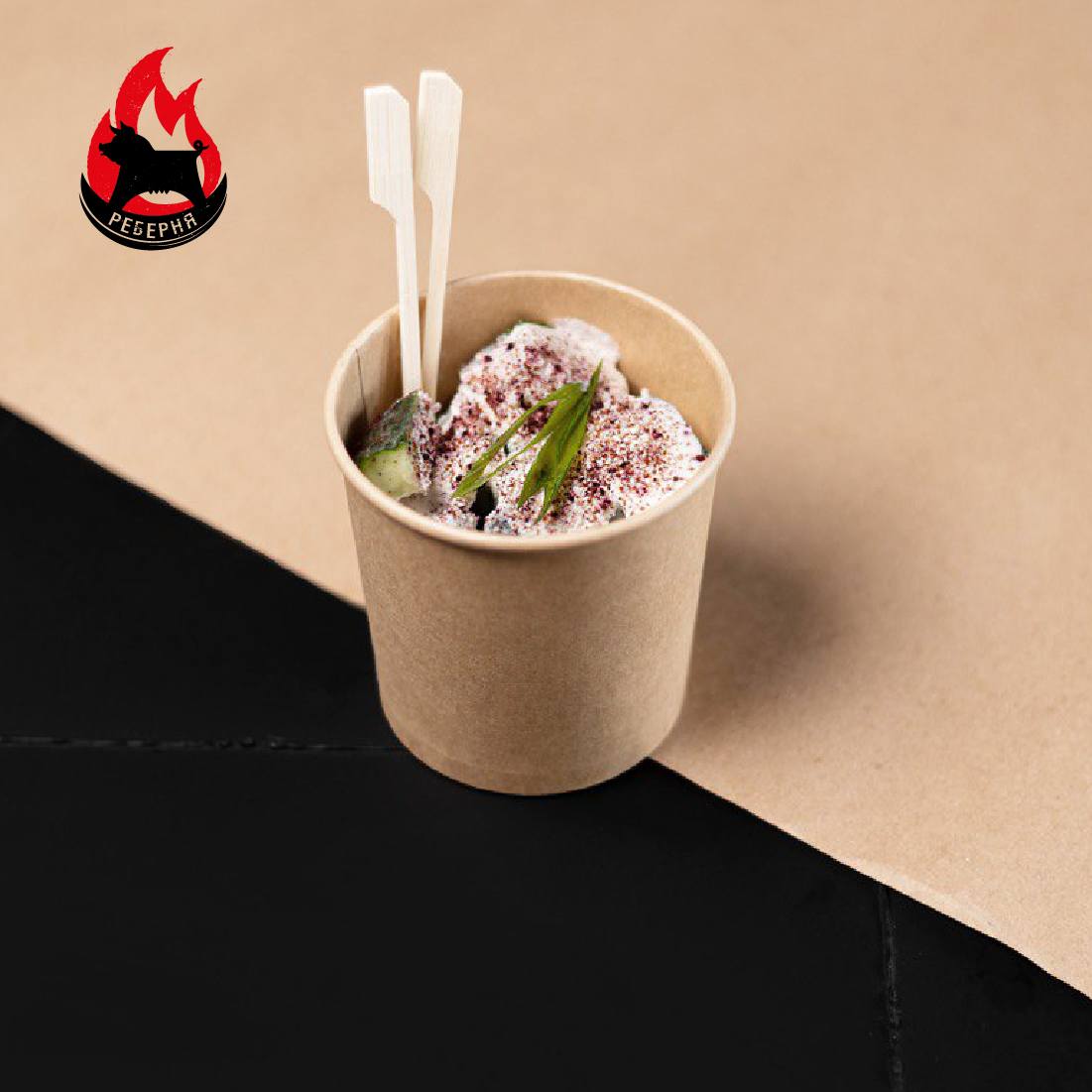 Огірки, соус сметана хрін, бринза овеча. Посипається спецією сумах та зеленою цибулею.