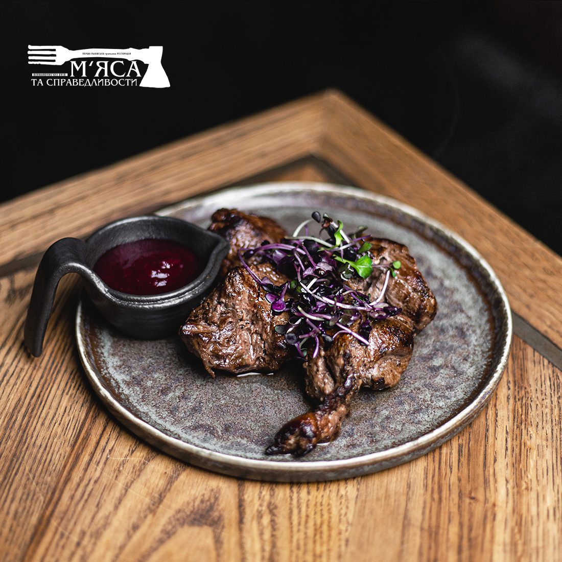 Яловичий шашлик подається з соусом з журавлини та мікрогріном. Маринад до шашлику: олія, соєвий соус, чорний мелений перець. Страва з мангалу. Прожарка за замовчуванням Medium.