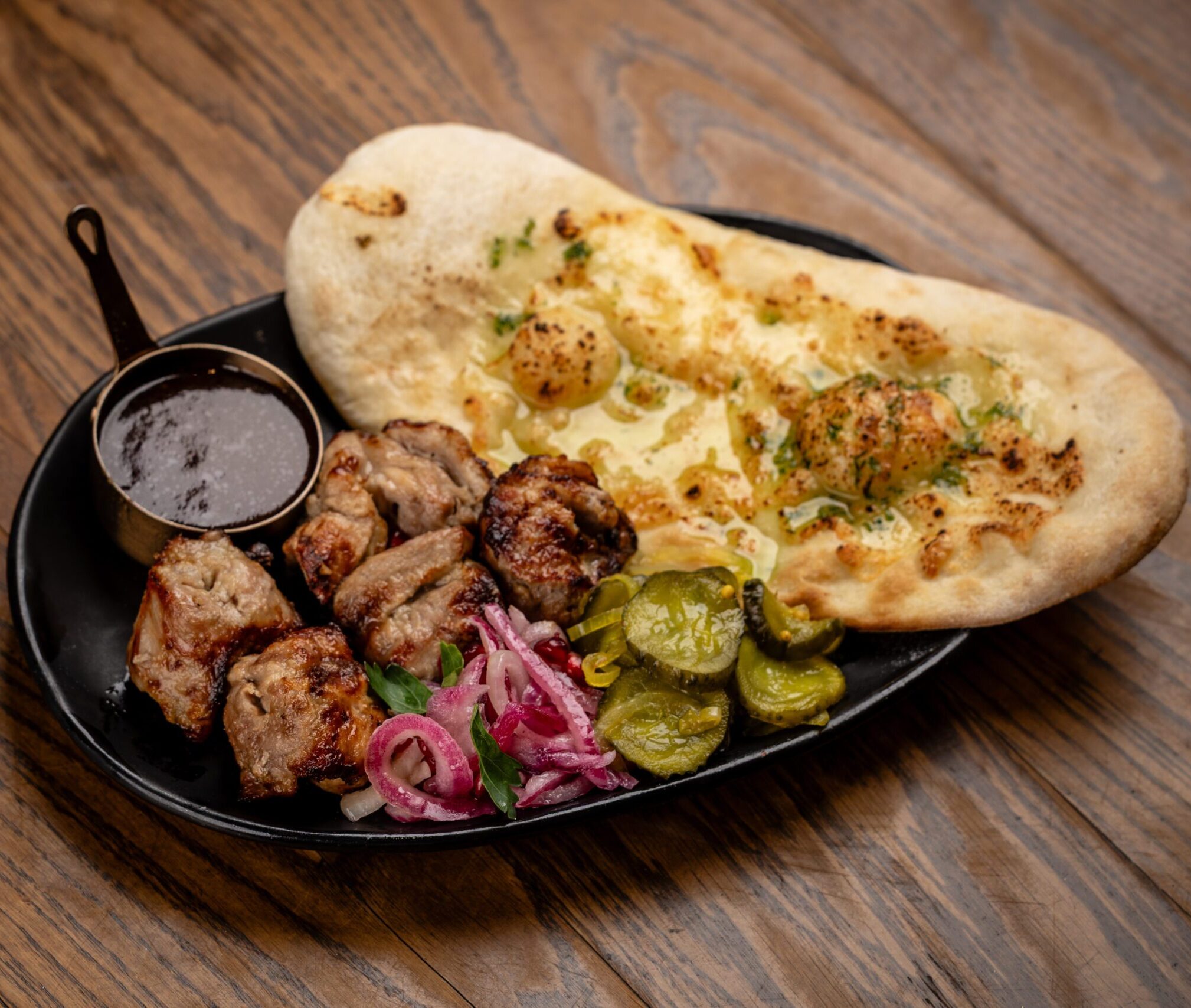Основою є свинний шашлик (200 г), приготований на вугіллі. До м’яса додаємо мариновані огірки (50 г) та мариновану цибулю (50 г), які викладаються поряд як гарнір. Поруч подається печена паляниця з додаванням мацарели та зеленого масла. Додатково до страви подаємо соус BBQ (40 г).