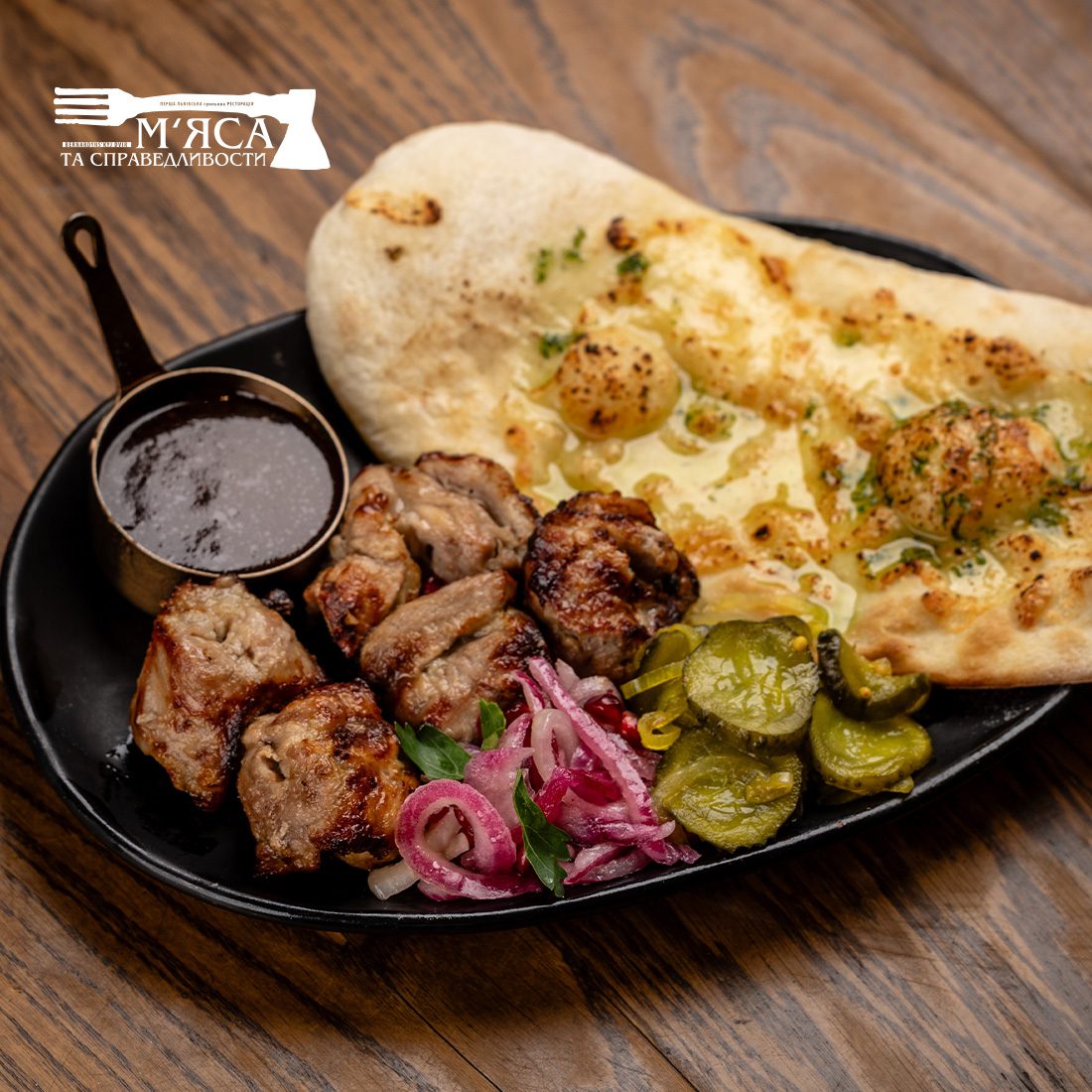 Основою є свинний шашлик (200 г), приготований на вугіллі. До м’яса додаємо мариновані огірки (50 г) та мариновану цибулю (50 г), які викладаються поряд як гарнір. Поруч подається печена паляниця з додаванням мацарели та зеленого масла. Додатково до страви подаємо соус BBQ (40 г).