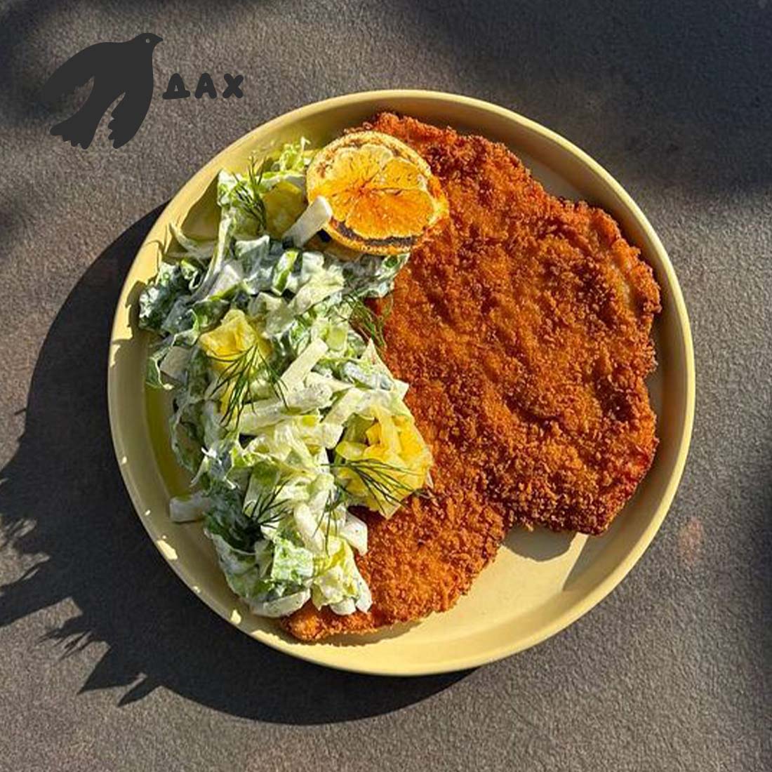 Шніцель з індика, салат ромен з фенхелем та яблуком, заправлений грецьким йогуртом, та солений лимон.