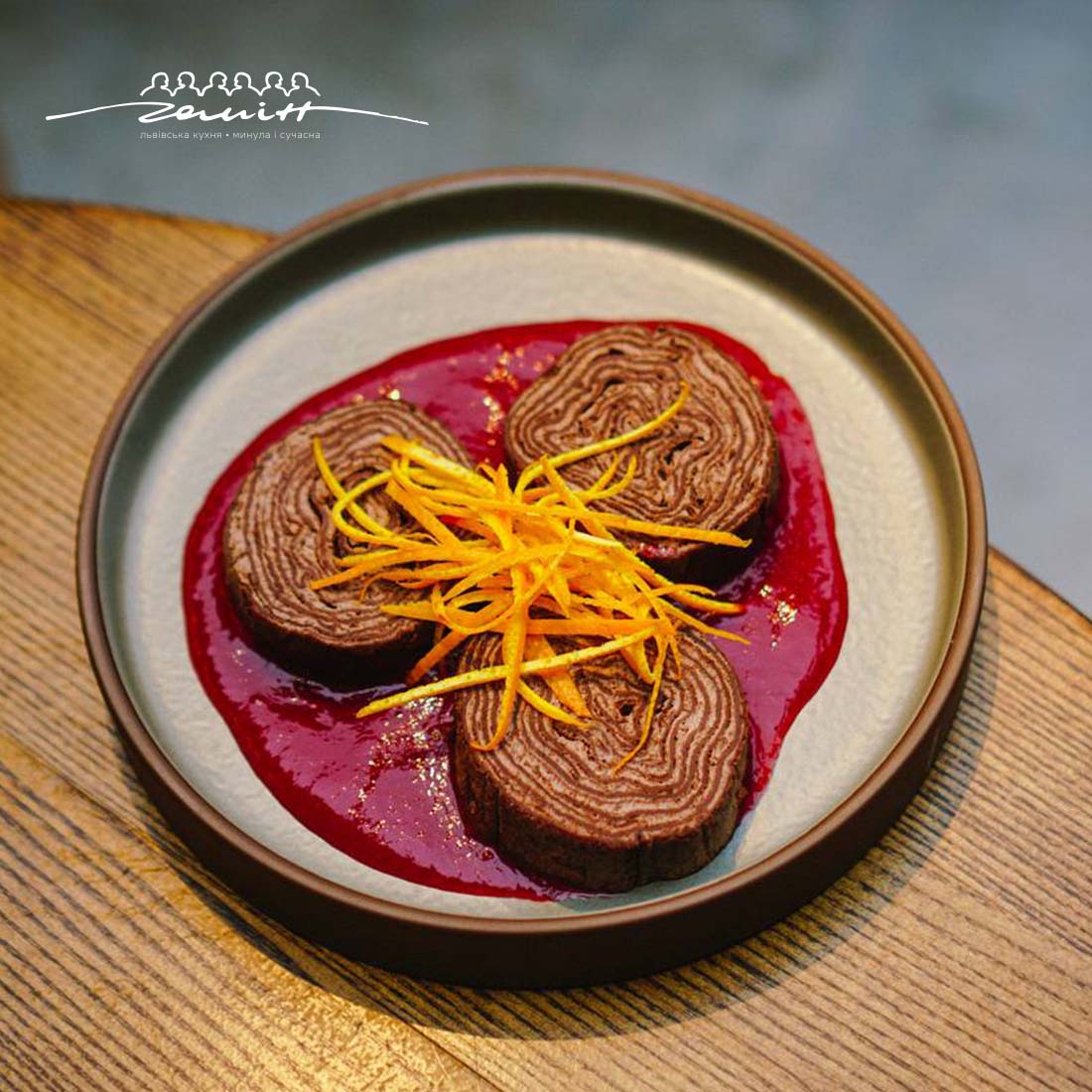 Карамельний рулет, кюлі малина-розмарин, цедра апельсину