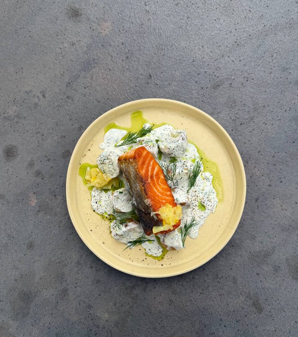 Стейк з лосося, молодою картоплею та каперсами у вершковому соусі та соленими лимонами.