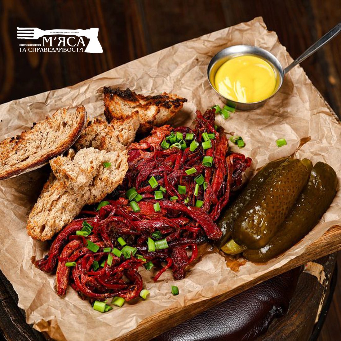 Грудинка яловича печена, гірчиця американська, огірок квашений, хліб пшенично житній, соус bbq.