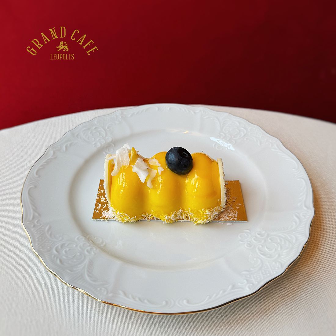 В основі екзотичний кокосовий бісквіт та ніжний мус з маракуї. Оздоблений жовтогарячим банановим желе