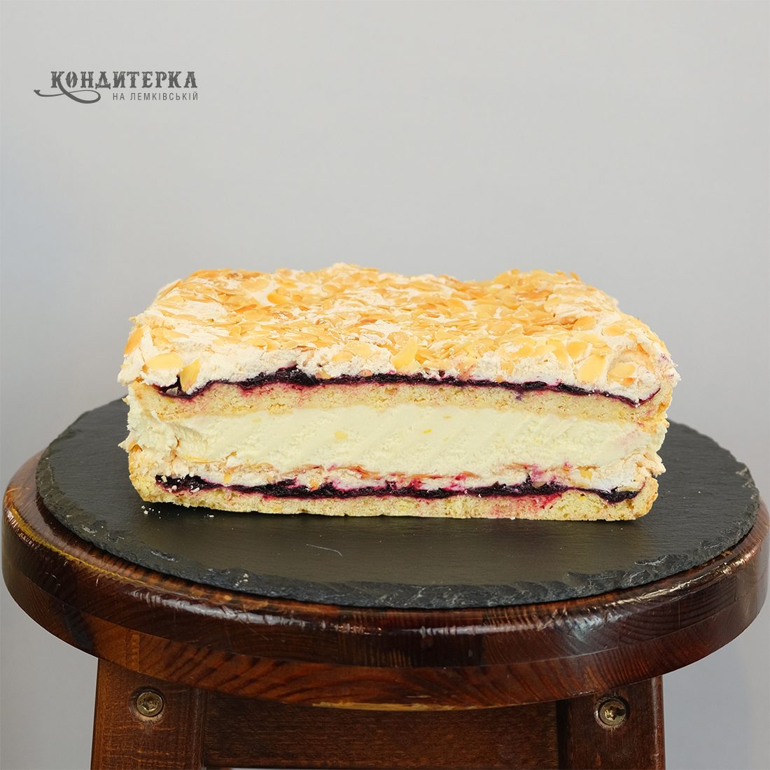 Пісочні коржі з смородиновим конфі та маренгою з додаванням мигдальних пластівців. Заварний крем.