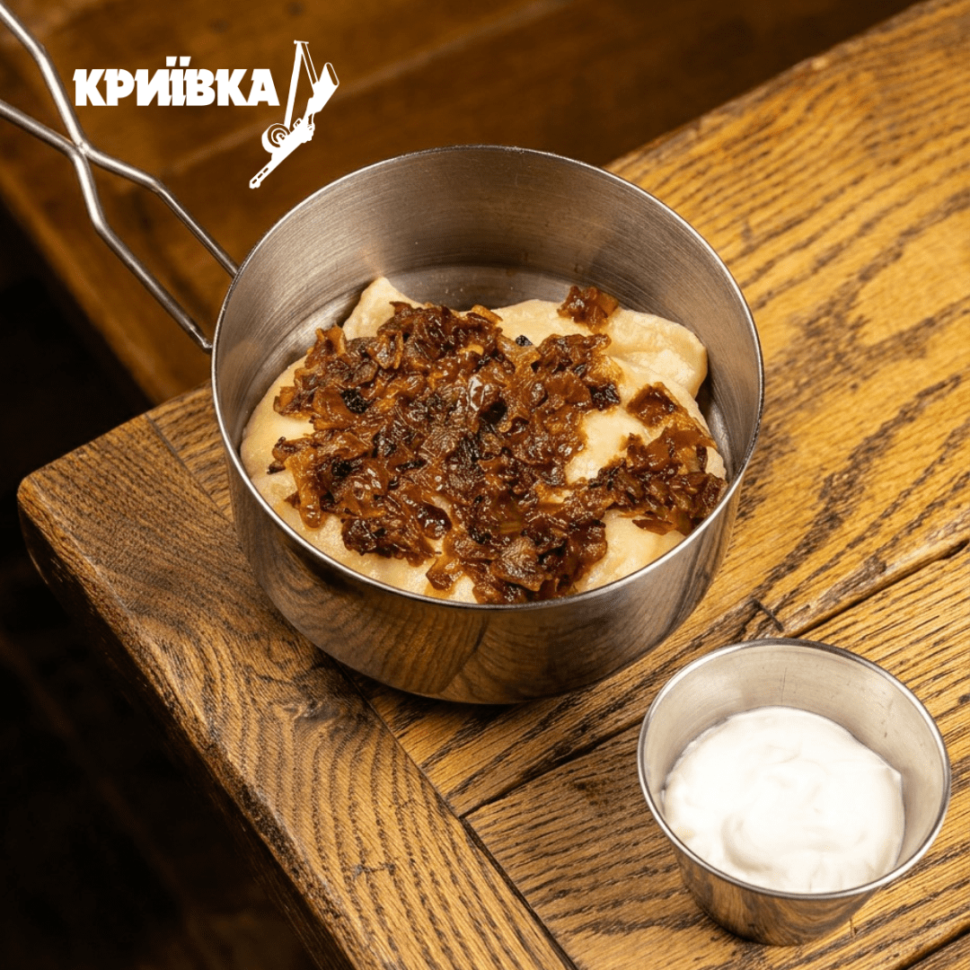 Вареники з картоплею. Посипаємо шкварками та смаженою цибулею. Додатково подається сметана.