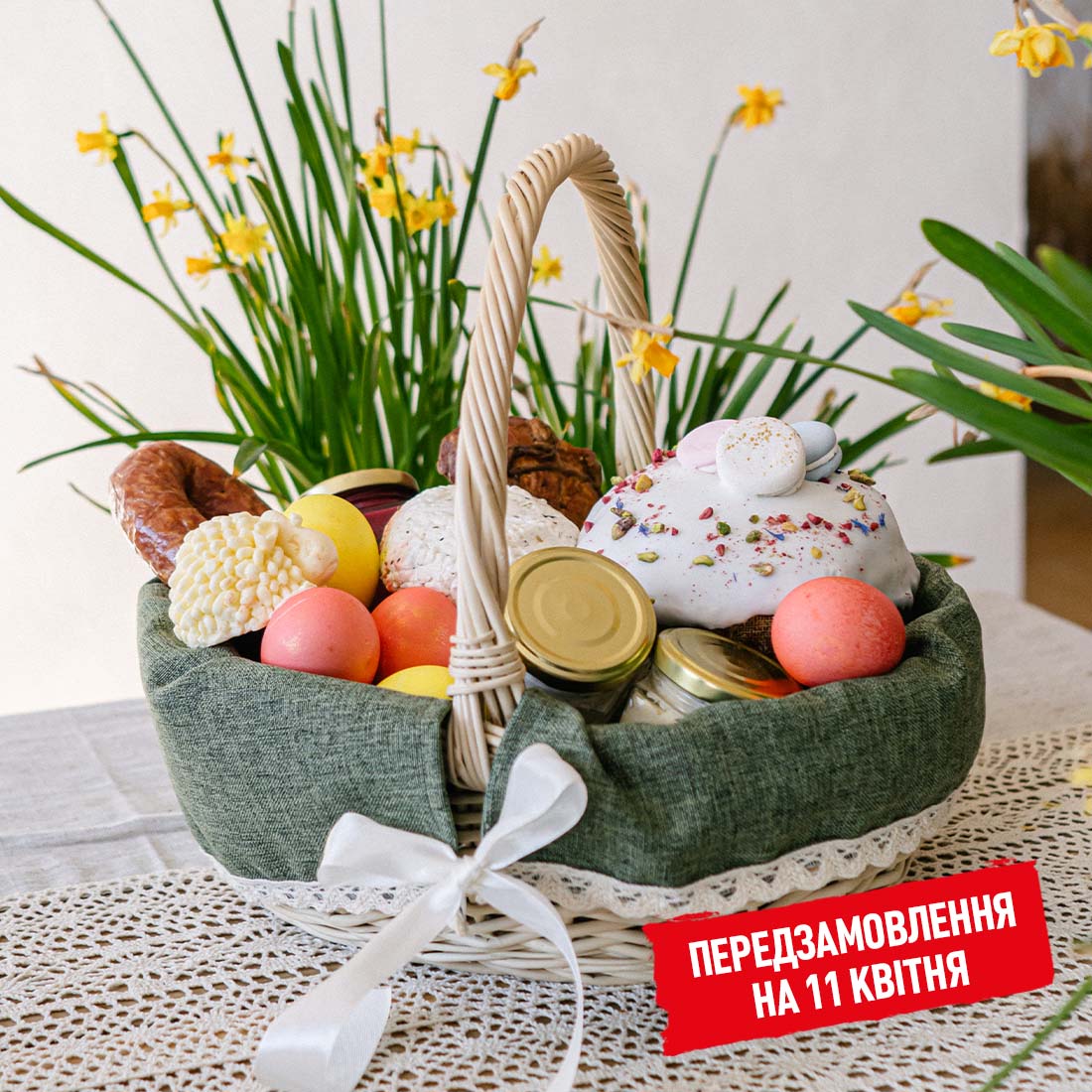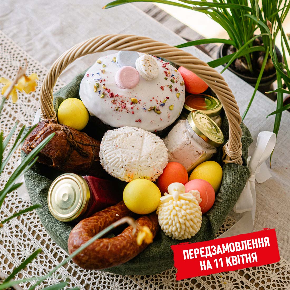 Свячений набір з Великодніми продуктами у кошику від !FEST Доставки