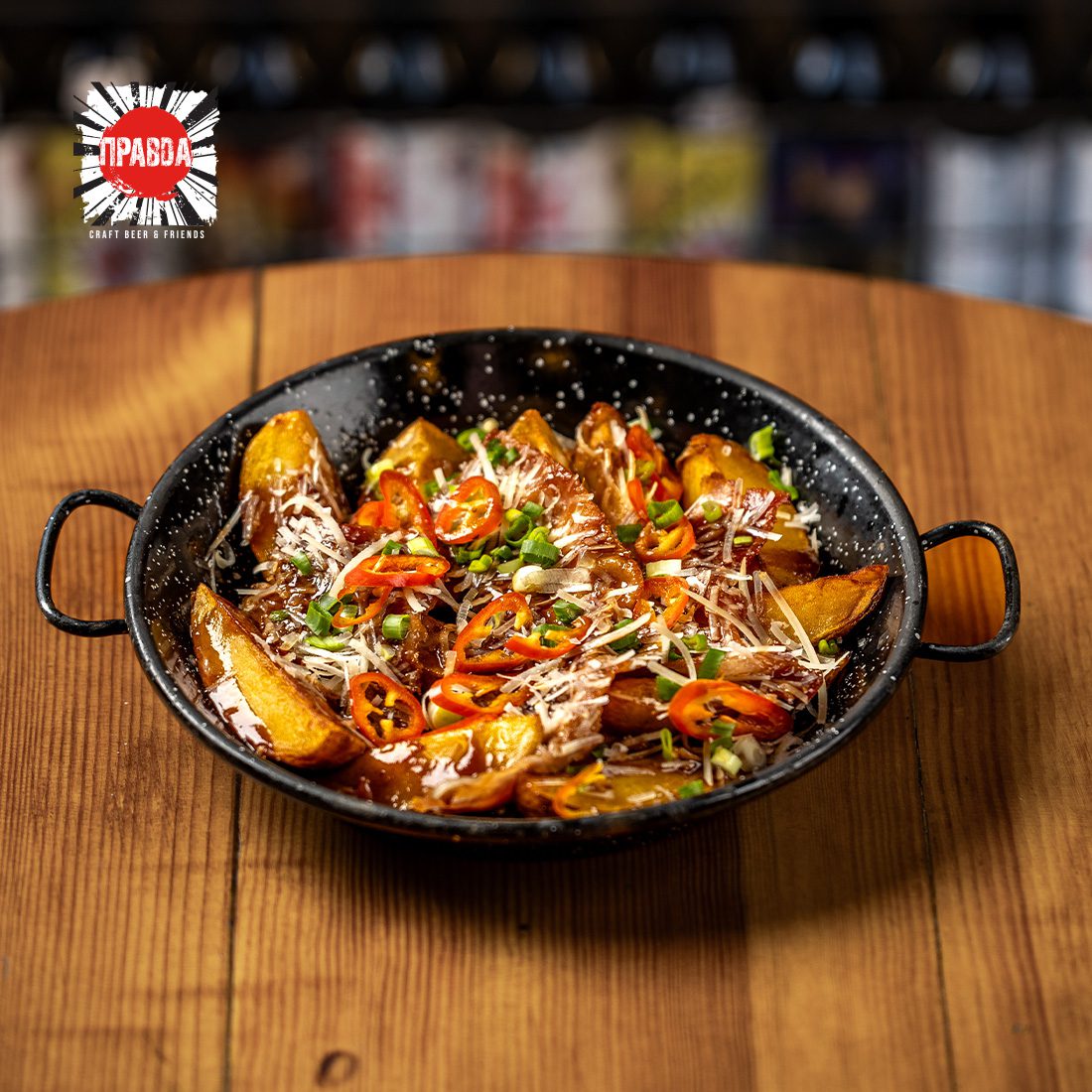 Запечена картопля з шпондером, пармезаном та соусом BBQ.